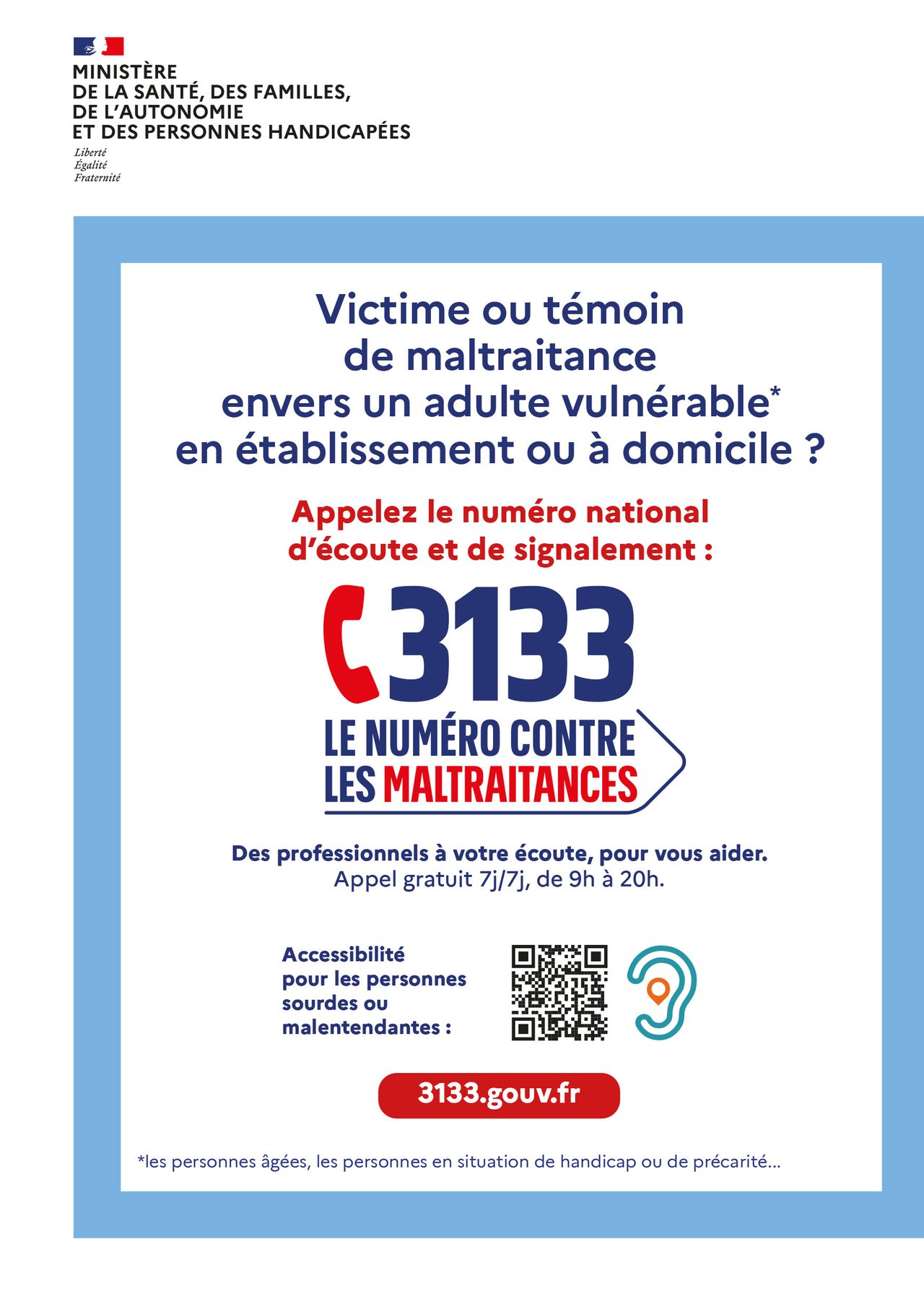 À compter du 1er mars 2026, la nouvelle plateforme téléphonique nationale 3133 dédiée au recueil des signalements de situations de maltraitance concernant les adultes vulnérables devient effective. Cette plateforme s’inscrit dans le renforcement du dispositif national de prévention et de lutte contre les maltraitances. Le 3133 remplace le 3977.