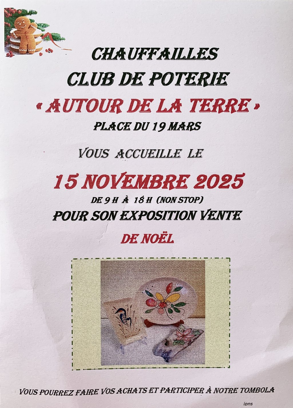 CHAUFFAILLES CLUB DE POTERIE " AUTOUR DE LA TERRE» PLACE DU 19 MARS VOUS ACCUEILLE LE 15 NOVEMBRE 2025 DE 9h À 18h (NON STOP) POUR SON EXPOSITION VENTE DE NOEL