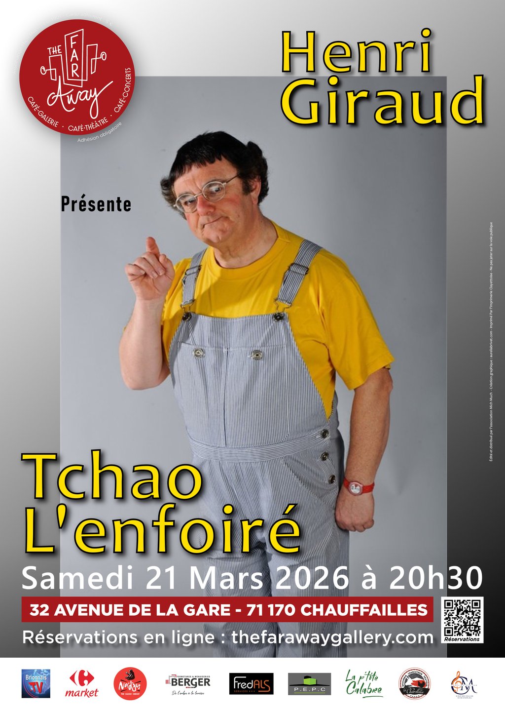Lien billetterie : https://www.thefaraway-gallery.com/billetterie/21-MAR-Imitateur-de-Coluche-Tchao-lenfoire-Henri-Giraud-p807131985/